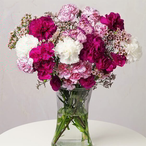 A delightful selection of long-lasting Carnations in shades of pink, purple and white complemented with pink Limonium and delicate Waxflower blooms. Paired with a keepsake butterfly pick for an extra special touch. Our letterbox flower gifts are delivered in specially designed letterbox friendly packaging and protected by fully compostable brown paper wrap, ensuring a wonderful and creative gift for the recipient. We send our Carnations in bud to ensure maximum vase life and guarantee our Carnations will last for at least two weeks.