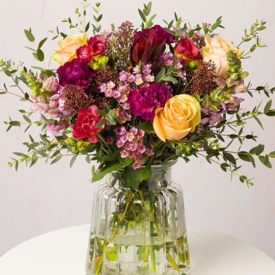 Embrace autumn with rich colours and textures with the Saffron Sunset bouquet. Featuring a mix of warm peach Roses, rich burgundy Carnations, and pink Snapdragons, all beautifully complemented by lush greenery.